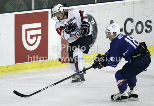 : Ziga Jeglic (8) of Slovenia and Yohann Auvitu (18) of France during the match of EICH Ice hockey tournament between Slovenia and France. Match between Slovenia and France was held in Tivoli Arena in Ljubljana, Slovenia, on Friday, 9th of November 2012. during match of EIHC ice hockey tournament between Slovenia and France. Match between Slovenia and France was played in Tivoli Arena in Ljubljana, Sloveni, on Friday, 9th of November 2012. Match was won by Slovenia, who defeated France with 3-1.