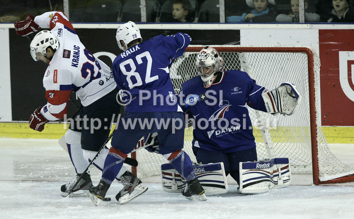 : Ales Kranjc (28) of Slovenia, Valentin Claireaux (82) of France and goalkeeper Christobal Huet of France during the match of EICH Ice hockey tournament between Slovenia and France. Match between Slovenia and France was held in Tivoli Arena in Ljubljana, Slovenia, on Friday, 9th of November 2012. during match of EIHC ice hockey tournament between Slovenia and France. Match between Slovenia and France was played in Tivoli Arena in Ljubljana, Sloveni, on Friday, 9th of November 2012. Match was won by Slovenia, who defeated France with 3-1.