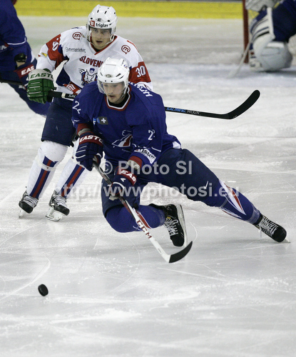 : Erik Pance (30) of Slovenia and Julien Desrosiers (24) of France during the match of EICH Ice hockey tournament between Slovenia and France. Match between Slovenia and France was held in Tivoli Arena in Ljubljana, Slovenia, on Friday, 9th of November 2012. during match of EIHC ice hockey tournament between Slovenia and France. Match between Slovenia and France was played in Tivoli Arena in Ljubljana, Sloveni, on Friday, 9th of November 2012. Match was won by Slovenia, who defeated France with 3-1.