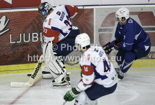 : Goalkeeper Robert Kristan of Slovenia and French player during the match of EICH Ice hockey tournament between Slovenia and France. Match between Slovenia and France was held in Tivoli Arena in Ljubljana, Slovenia, on Friday, 9th of November 2012. during match of EIHC ice hockey tournament between Slovenia and France. Match between Slovenia and France was played in Tivoli Arena in Ljubljana, Sloveni, on Friday, 9th of November 2012. Match was won by Slovenia, who defeated France with 3-1.