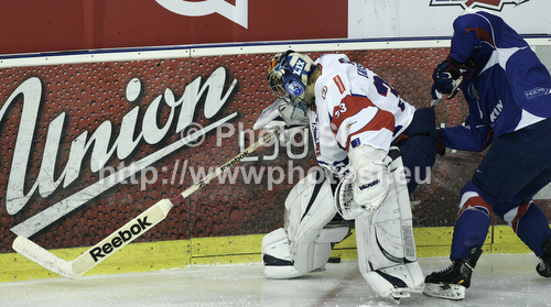 : Goalkeeper Robert Kristan of Slovenia and French player during the match of EICH Ice hockey tournament between Slovenia and France. Match between Slovenia and France was held in Tivoli Arena in Ljubljana, Slovenia, on Friday, 9th of November 2012. during match of EIHC ice hockey tournament between Slovenia and France. Match between Slovenia and France was played in Tivoli Arena in Ljubljana, Sloveni, on Friday, 9th of November 2012. Match was won by Slovenia, who defeated France with 3-1.