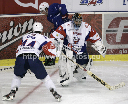 : Goalkeeper Robert Kristan of Slovenia and French player during the match of EICH Ice hockey tournament between Slovenia and France. Match between Slovenia and France was held in Tivoli Arena in Ljubljana, Slovenia, on Friday, 9th of November 2012. during match of EIHC ice hockey tournament between Slovenia and France. Match between Slovenia and France was played in Tivoli Arena in Ljubljana, Sloveni, on Friday, 9th of November 2012. Match was won by Slovenia, who defeated France with 3-1.