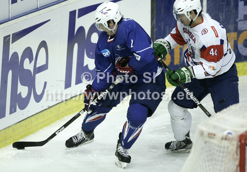 : Igor Cvetek (44) of Slovenia and French player during the match of EICH Ice hockey tournament between Slovenia and France. Match between Slovenia and France was held in Tivoli Arena in Ljubljana, Slovenia, on Friday, 9th of November 2012. during match of EIHC ice hockey tournament between Slovenia and France. Match between Slovenia and France was played in Tivoli Arena in Ljubljana, Sloveni, on Friday, 9th of November 2012. Match was won by Slovenia, who defeated France with 3-1.
