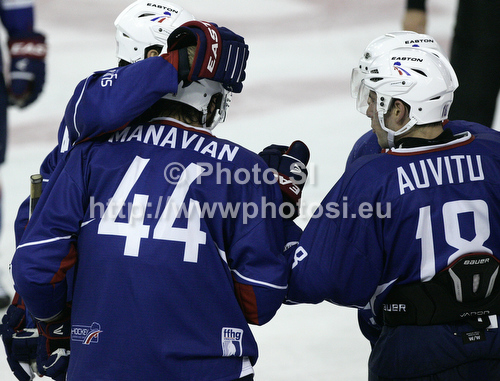 : French players celebrating their goal during the match of EICH Ice hockey tournament between Slovenia and France. Match between Slovenia and France was held in Tivoli Arena in Ljubljana, Slovenia, on Friday, 9th of November 2012. during match of EIHC ice hockey tournament between Slovenia and France. Match between Slovenia and France was played in Tivoli Arena in Ljubljana, Sloveni, on Friday, 9th of November 2012. Match was won by Slovenia, who defeated France with 3-1.