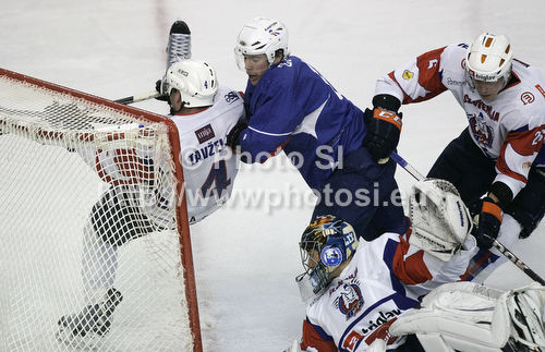 : Andrej Tavzelj (4) of Slovenia and goalkeeper Robert Kristan of France during the match of EICH Ice hockey tournament between Slovenia and France. Match between Slovenia and France was held in Tivoli Arena in Ljubljana, Slovenia, on Friday, 9th of November 2012. during match of EIHC ice hockey tournament between Slovenia and France. Match between Slovenia and France was played in Tivoli Arena in Ljubljana, Sloveni, on Friday, 9th of November 2012. Match was won by Slovenia, who defeated France with 3-1.