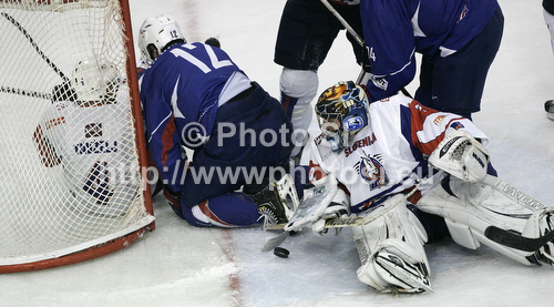: Andrej Tavzelj (4) of Slovenia and goalkeeper Robert Kristan of France during the match of EICH Ice hockey tournament between Slovenia and France. Match between Slovenia and France was held in Tivoli Arena in Ljubljana, Slovenia, on Friday, 9th of November 2012. during match of EIHC ice hockey tournament between Slovenia and France. Match between Slovenia and France was played in Tivoli Arena in Ljubljana, Sloveni, on Friday, 9th of November 2012. Match was won by Slovenia, who defeated France with 3-1.