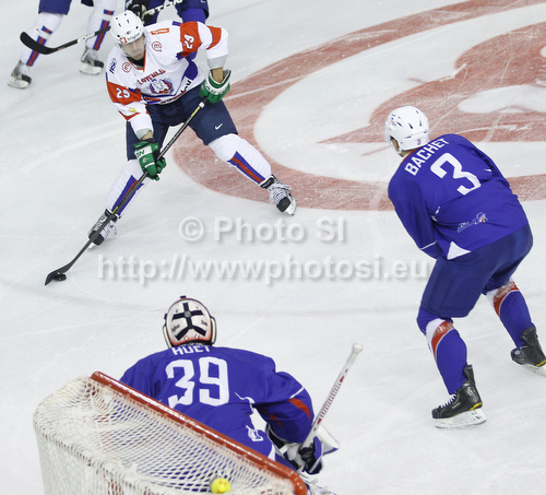 : Anze Ropret of Slovenia (29) Vincent Bachet (3) of France and goalkeeper Christobal Huet (39) of France during the match of EICH Ice hockey tournament between Slovenia and France. Match between Slovenia and France was held in Tivoli Arena in Ljubljana, Slovenia, on Friday, 9th of November 2012. during match of EIHC ice hockey tournament between Slovenia and France. Match between Slovenia and France was played in Tivoli Arena in Ljubljana, Sloveni, on Friday, 9th of November 2012. Match was won by Slovenia, who defeated France with 3-1.