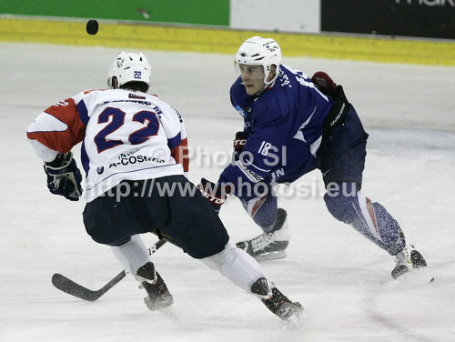 : Marcel Rodman (22) of Slovenia Yohann Auvitu (18)of France during the match of EICH Ice hockey tournament between Slovenia and France. Match between Slovenia and France was held in Tivoli Arena in Ljubljana, Slovenia, on Friday, 9th of November 2012. during match of EIHC ice hockey tournament between Slovenia and France. Match between Slovenia and France was played in Tivoli Arena in Ljubljana, Sloveni, on Friday, 9th of November 2012. Match was won by Slovenia, who defeated France with 3-1.
