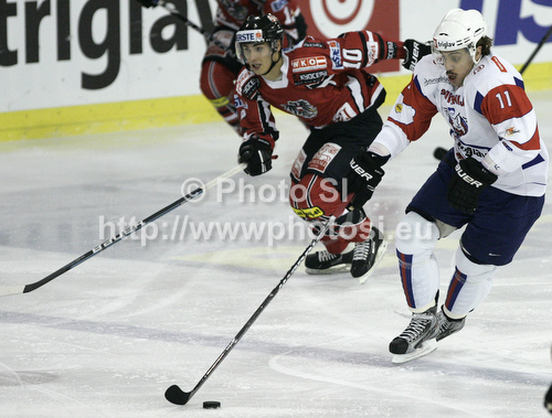 : Anze Kopitar (no.11) of Slovenia and Daniel Oberkofler (no.10) of Austria during match of EIHC Ice hockey tournament between Slovenia and Austria. Match between Slovenia and Austria was held in Ljubljana Hala Tivoli arena, Slovenia, on Saturday, 10th of November 2012.