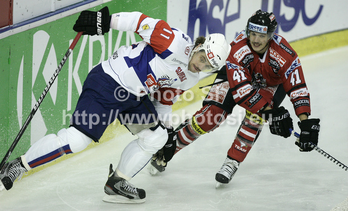 : Anze Kopitar (no.11) of Slovenia and Mario Altmann (no.41) of Austria during match of EIHC Ice hockey tournament between Slovenia and Austria. Match between Slovenia and Austria was held in Ljubljana Hala Tivoli arena, Slovenia, on Saturday, 10th of November 2012.