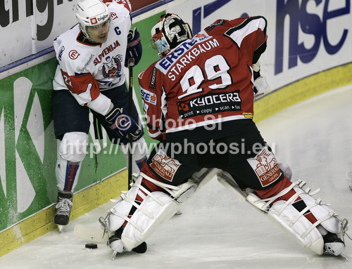 : Marcel Rodman (no.22) of Slovenia and Bernhard Starkbaum (no.29) of Austria during match of EIHC Ice hockey tournament between Slovenia and Austria. Match between Slovenia and Austria was held in Ljubljana Hala Tivoli arena, Slovenia, on Saturday, 10th of November 2012.