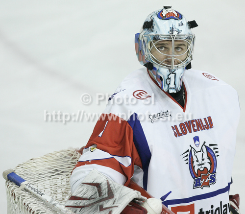 : Andrej Hocevar (no.1) of Slovenia during match of EIHC Ice hockey tournament between Slovenia and Austria. Match between Slovenia and Austria was held in Ljubljana Hala Tivoli arena, Slovenia, on Saturday, 10th of November 2012.