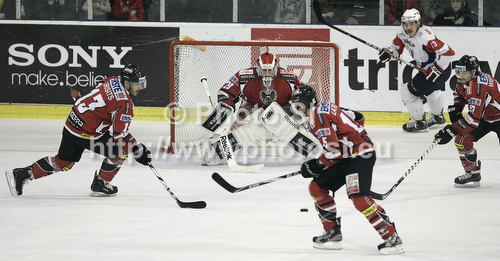 : Johannes Kirisits (no.13) of Austria, Bernhard Starkbaum (no.29) of Austria and Manuel Latusa (no.15) of Austria during match of EIHC Ice hockey tournament between Slovenia and Austria. Match between Slovenia and Austria was held in Ljubljana Hala Tivoli arena, Slovenia, on Saturday, 10th of November 2012.