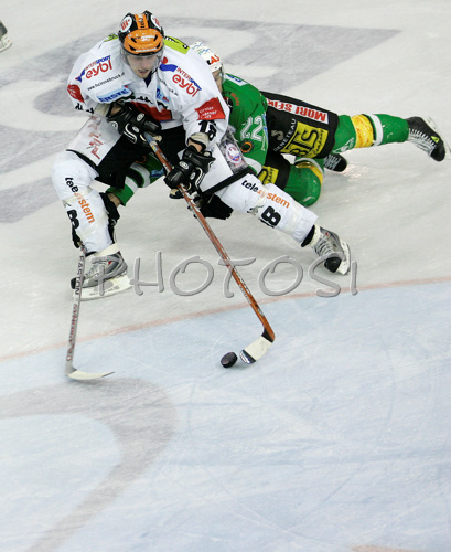 Ljubljana ,Slovenia - 03.02.2008 : Martin Pewal (no.18) of HC TWK Innsbruck (front) attacking while Greg Kuznik (no.22) of ZM Olimpija (back) is trying to block him during match of 46th round of EBEL League between ZM Olimpija, Ljubljana, Slovenia and HC TWK Innsbruck, Austria. Match was won by ZM Olimpija who defeated HC TWK Innsbruck with 5:2. Match was played in Tivoli Arena in Ljubljana, Slovenia on 3rd of February 2008. Photo by: Primoz Jeroncic