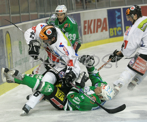 : Matej Hocevar (no.41) of ZM Olimpija (on ice) and Armin Helfer (no.6) of HC TWK Innsbruck (L) fighting for puck during match of 46th round of EBEL League between ZM Olimpija, Ljubljana, Slovenia and HC TWK Innsbruck, Austria. Match was won by ZM Olimpija who defeated HC TWK Innsbruck with 5:2. Match was played in Tivoli Arena in Ljubljana, Slovenia on 3rd of February 2008.