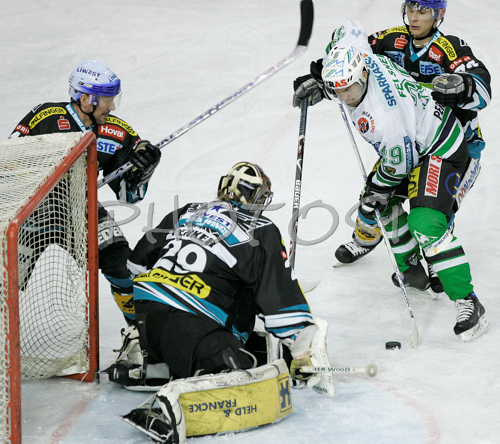 : Brian Felsner (no.39) of ZM Olimpija (M) infront of goalie Jurgen Penker (no.29) of EHC Black Wings Linz (L) during second half finals match of EBEL League between ZM Olimpija, Ljubljana, Slovenia and EHC Black Wings Linz, Austria. Match was won by ZM Olimpija who defeated EHC Black Wings Linz with 3:2. Match was played in Tivoli Arena in Ljubljana, Slovenia on 28th of February 2008.