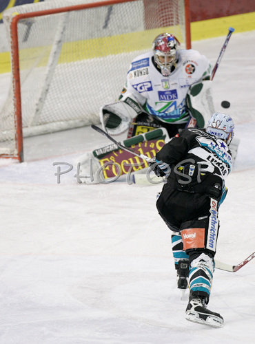 : Philipp Lukas (no.21) of EHC Black Wings Linz (front) shooting on goal of Alex Westlund (no.30) of ZM Olimpija (back) during second half finals match of EBEL League between ZM Olimpija, Ljubljana, Slovenia and EHC Black Wings Linz, Austria. Match was won by ZM Olimpija who defeated EHC Black Wings Linz with 3:2. Match was played in Tivoli Arena in Ljubljana, Slovenia on 28th of February 2008.