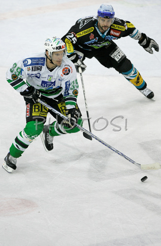 : Brian Felsner (no.39) of ZM Olimpija (L) and Mark Szucs (no.25) of EHC Black Wings Linz (R) during second half finals match of EBEL League between ZM Olimpija, Ljubljana, Slovenia and EHC Black Wings Linz, Austria. Match was won by ZM Olimpija who defeated EHC Black Wings Linz with 3:2. Match was played in Tivoli Arena in Ljubljana, Slovenia on 28th of February 2008.