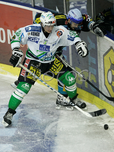 : Pasi Petrilainen (no.38) of ZM Olimpija (L) and Mark Szucs (no.25) of EHC Black Wings Linz (R) during second half finals match of EBEL League between ZM Olimpija, Ljubljana, Slovenia and EHC Black Wings Linz, Austria. Match was won by ZM Olimpija who defeated EHC Black Wings Linz with 3:2. Match was played in Tivoli Arena in Ljubljana, Slovenia on 28th of February 2008.