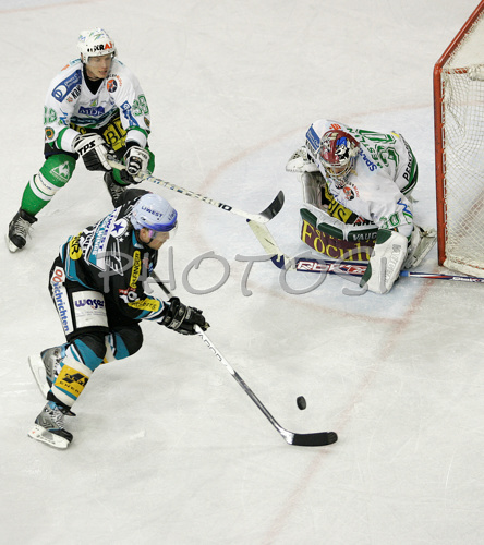 : Rob Shearer (no.19) of EHC Black Wings Linz (M) amd Pasi Petrilainen (no.38) of ZM Olimpija (L) infront of goalie Alex Westlund (no.30) of ZM Olimpija (R) during second half finals match of EBEL League between ZM Olimpija, Ljubljana, Slovenia and EHC Black Wings Linz, Austria. Match was won by ZM Olimpija who defeated EHC Black Wings Linz with 3:2. Match was played in Tivoli Arena in Ljubljana, Slovenia on 28th of February 2008.
