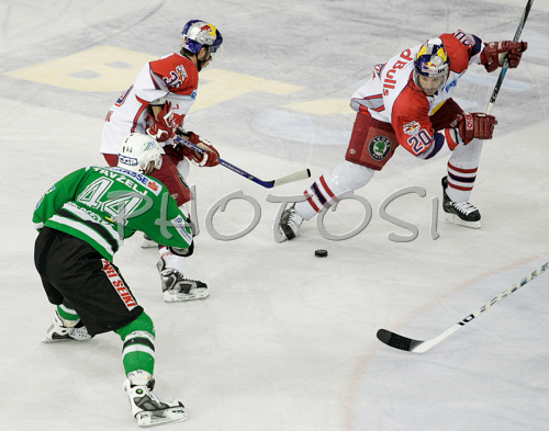 : Marco Pewal (no.36) of Red Bull Salzburg (M), Andrej Tavzelj (no.44) of ZM Olimpija (L) and Daniel Welser (no.20) of Red Bull Salzburg (R) during second match of finals of EBEL League between ZM Olimpija, Ljubljana, Slovenia and Red Bull Salzburg, Austria. Match was won by Red Bull Salzburg who defeated ZM Olimpija with 1:3. Match was played in Tivoli Arena in Ljubljana, Slovenia on 16th of March 2008.