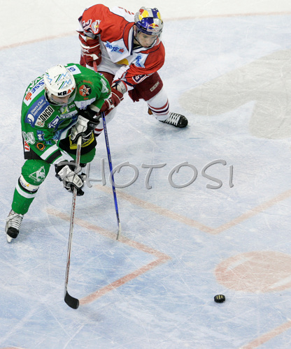 : Matej Hocevar (no.41) of ZM Olimpija (L) and Marco Pewal (no.36) of Red Bull Salzburg (R) during second match of finals of EBEL League between ZM Olimpija, Ljubljana, Slovenia and Red Bull Salzburg, Austria. Match was won by Red Bull Salzburg who defeated ZM Olimpija with 1:3. Match was played in Tivoli Arena in Ljubljana, Slovenia on 16th of March 2008.