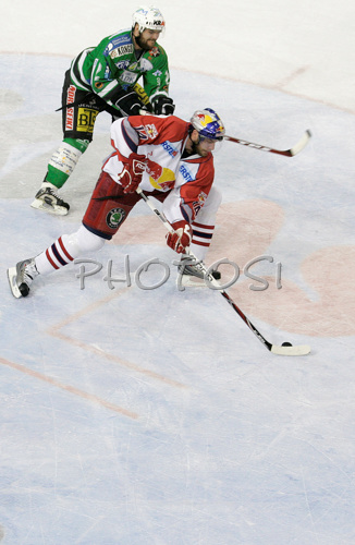 : Josh Green (no.14) of Red Bull Salzburg (R) and Kevin Mitchell (no.2) of ZM Olimpija (L) during second match of finals of EBEL League between ZM Olimpija, Ljubljana, Slovenia and Red Bull Salzburg, Austria. Match was won by Red Bull Salzburg who defeated ZM Olimpija with 1:3. Match was played in Tivoli Arena in Ljubljana, Slovenia on 16th of March 2008.