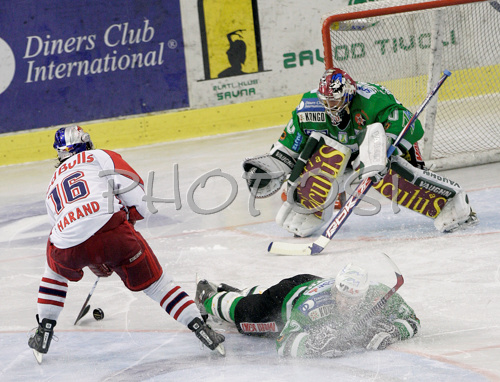 : Patrick Harand (no.16) of Red Bull Salzburg (L) infront of goalie Alex Westlund (no.30) of ZM Olimpija (R) during second match of finals of EBEL League between ZM Olimpija, Ljubljana, Slovenia and Red Bull Salzburg, Austria. Match was won by Red Bull Salzburg who defeated ZM Olimpija with 1:3. Match was played in Tivoli Arena in Ljubljana, Slovenia on 16th of March 2008.