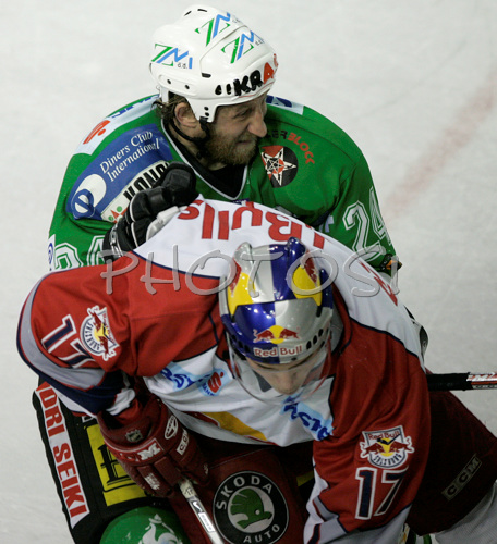 : Tomaz Vnuk (no.24) of ZM Olimpija (back) and Victor Lindgren (no.17) of Red Bull Salzburg (front) during second match of finals of EBEL League between ZM Olimpija, Ljubljana, Slovenia and Red Bull Salzburg, Austria. Match was won by Red Bull Salzburg who defeated ZM Olimpija with 1:3. Match was played in Tivoli Arena in Ljubljana, Slovenia on 16th of March 2008.
