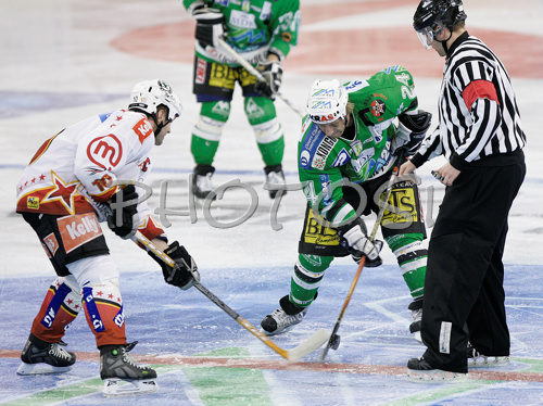 : Tomaz Vnuk (no.24) of ZM Olimpija (R) and Dejan Varl (no.10) of HK Acroni Jesenice (L) during third match of Slovenian National Championships finals between ZM Olimpija, Ljubljana, Slovenia and HK Acroni Jesenice, Slovenia. Match was won by Acroni Jesenice who defeated ZM Olimpija with 1:2. Match was played in Tivoli Arena in Ljubljana, Slovenia on 8th of April 2008.