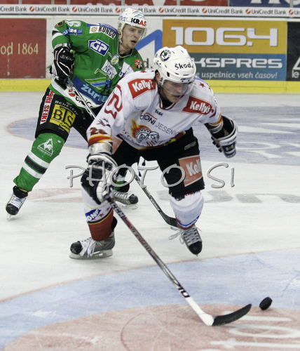 : Ales Kranjc (no.28) of HK Acroni Jesenice (front) and Bostjan Groznik (no.6) of ZM Olimpija (back) during third match of Slovenian National Championships finals between ZM Olimpija, Ljubljana, Slovenia and HK Acroni Jesenice, Slovenia. Match was won by Acroni Jesenice who defeated ZM Olimpija with 1:2. Match was played in Tivoli Arena in Ljubljana, Slovenia on 8th of April 2008.