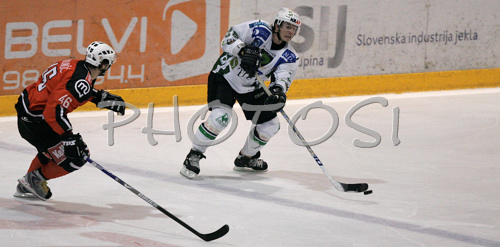 Jesenice ,Slovenia - 12.10.2008 : Pasi Petrilainen (no.36) of HDD Tilia Olimpija (R) and Gregor Poloncic (no.46) of HK Acroni Jesenice (L) during match of Erste Bank Eishockey Liga 2008-09 between HK Acroni Jesenice, Jesenice, Slovenia and HDD Tilia Olimpija, Ljubjana, Slovenia. HK Acroni Jesenice won match and defeated HDD Tilia Olimpija 8:2. Match of EBEL League was played in Podmezaklja arena in Jesenice, Slovenia on 12th of October 2008. Photo by: Primoz Jeroncic