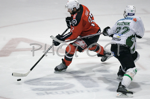 : Jean Philippe Pare (no.32) of HK Acroni Jesenice (L) is too fast for Greg Kuznik (no.22) of HDD Tilia Olimpija (R) during match of Erste Bank Eishockey Liga 2008-09 between HK Acroni Jesenice, Jesenice, Slovenia and HDD Tilia Olimpija, Ljubjana, Slovenia. HK Acroni Jesenice won match and defeated HDD Tilia Olimpija 8:2. Match of EBEL League was played in Podmezaklja arena in Jesenice, Slovenia on 12th of October 2008.