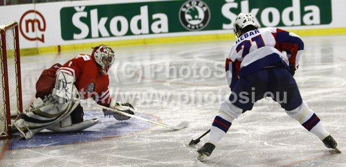 : Andrej Hebar (no.21) of Slovenia (R) infront of Krzysztof Zborowski (no.1) of Poland (L) during ice hockey match of IIHF Ice hockey World championships Division I, group B between Slovenia and Poland. Match between Slovenia and Poland of IIHF Ice hockey World championships Division I, group B was held on Saturday, 17th of April 2010 in Ljubljana, Slovenia. Slovenia defeated Poland with 3-2.