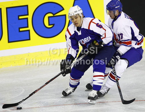 : Min Ho Cho (no.6) of Korea (L) and Russell Cowley (no.17) of Great Britain (R) during ice hockey match of IIHF Ice hockey World championships Division I, group B between Great Britain and Korea. Match between Great Britain and Korea of IIHF Ice hockey World championships Division I, group B was held on Sunday, 18th of April 2010 in Ljubljana, Slovenia.