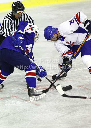 Ljubljana ,Slovenia - 18.04.2010 : Ki Sung Kim (no.19) of Korea (L) and Ben OConnor (no.27) of Great Britain (R) during ice hockey match of IIHF Ice hockey World championships Division I, group B between Great Britain and Korea. Match between Great Britain and Korea of IIHF Ice hockey World championships Division I, group B was held on Sunday, 18th of April 2010 in Ljubljana, Slovenia. Photo by: Primoz Jeroncic