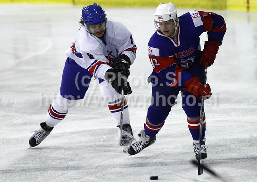 : Jan Mursak (no.13) of Slovenia (R) and Matt Myers (no.8) of Great Britain (L) during ice hockey match of IIHF Ice hockey World championships Division I, group B between Great Britain and Slovenia. Match between Great Britain and Slovenia of IIHF Ice hockey World championships Division I, group B was held on Tuesday, 20th of April 2010 in Ljubljana, Slovenia.
