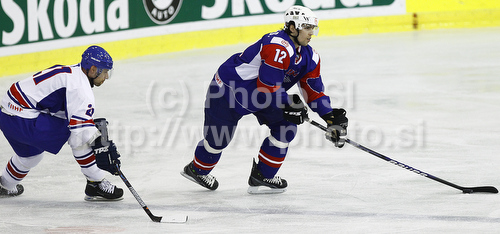 : David Rodman (no.12) of Slovenia (R) and Ashley Tait (no.21) of Great Britain (L) during ice hockey match of IIHF Ice hockey World championships Division I, group B between Great Britain and Slovenia. Match between Great Britain and Slovenia of IIHF Ice hockey World championships Division I, group B was held on Tuesday, 20th of April 2010 in Ljubljana, Slovenia.