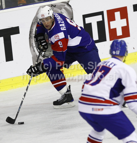 : Tomaz Razingar (no.9) of Slovenia (L) and Russell Cowley (no.17) of Great Britain (R) during ice hockey match of IIHF Ice hockey World championships Division I, group B between Great Britain and Slovenia. Match between Great Britain and Slovenia of IIHF Ice hockey World championships Division I, group B was held on Tuesday, 20th of April 2010 in Ljubljana, Slovenia.