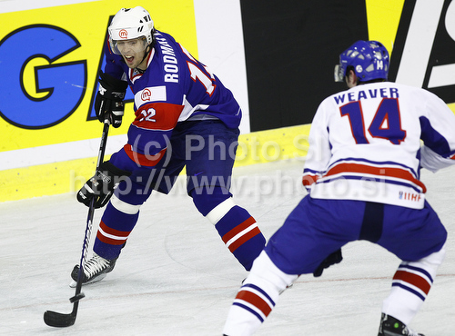 : David Rodman (no.12) of Slovenia (L) and Jonathan Weaver (no.14) of Great Britain (R) during ice hockey match of IIHF Ice hockey World championships Division I, group B between Great Britain and Slovenia. Match between Great Britain and Slovenia of IIHF Ice hockey World championships Division I, group B was held on Tuesday, 20th of April 2010 in Ljubljana, Slovenia.