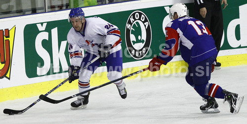 Ljubljana ,Slovenia - 20.04.2010 : Greg Chambers (no.24) of Great Britain (L) and Jan Mursak (no.13) of Slovenia (R) during ice hockey match of IIHF Ice hockey World championships Division I, group B between Great Britain and Slovenia. Match between Great Britain and Slovenia of IIHF Ice hockey World championships Division I, group B was held on Tuesday, 20th of April 2010 in Ljubljana, Slovenia. Photo by: Primoz Jeroncic