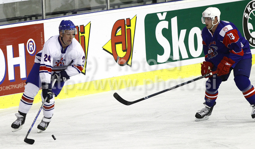 : Greg Chambers (no.24) of Great Britain (L) and Jan Mursak (no.13) of Slovenia (R) during ice hockey match of IIHF Ice hockey World championships Division I, group B between Great Britain and Slovenia. Match between Great Britain and Slovenia of IIHF Ice hockey World championships Division I, group B was held on Tuesday, 20th of April 2010 in Ljubljana, Slovenia.