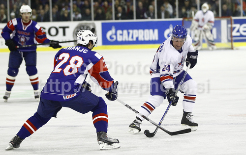 : Greg Chambers (no.24) of Great Britain (R) and Ales Kranjc (no.28) of Slovenia (L) during ice hockey match of IIHF Ice hockey World championships Division I, group B between Great Britain and Slovenia. Match between Great Britain and Slovenia of IIHF Ice hockey World championships Division I, group B was held on Tuesday, 20th of April 2010 in Ljubljana, Slovenia.