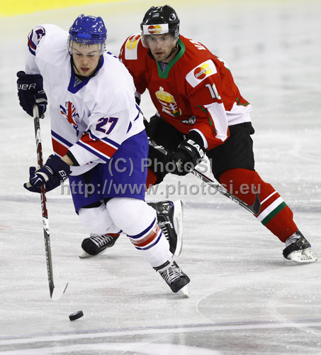 Ljubljana ,Slovenia - 21.04.2010 : Ben OConnor (no.27) of Great Britain (L) and Martons Vas (no.10) of Hungary (R) during ice hockey match of IIHF Ice hockey World championships Division I, group B between Great Britain and Hungary. Match between Great Britain and Hungary of IIHF Ice hockey World championships Division I, group B was held on Wednesday, 21st of April 2010 in Ljubljana, Slovenia. Photo by: Primoz Jeroncic