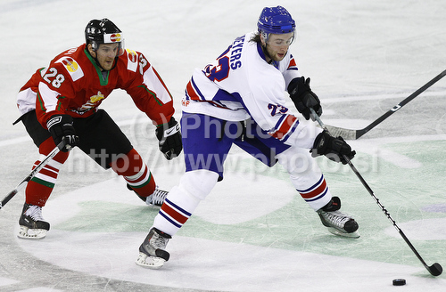 : Danny Meyers (no.23) of Great Britain (R) and Imre Peterdi (no.28) of Hungary (L) during ice hockey match of IIHF Ice hockey World championships Division I, group B between Great Britain and Hungary. Match between Great Britain and Hungary of IIHF Ice hockey World championships Division I, group B was held on Wednesday, 21st of April 2010 in Ljubljana, Slovenia.