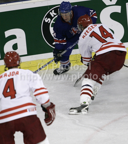 : Greg Chambers (no.24) of Great Britain (L) and Jakub Rzeszutko (no.14) of Poland (R) during ice hockey match of IIHF Ice hockey World championships Division I, group B between Great Britain and Poland. Match between Great Britain and Poland of IIHF Ice hockey World championships Division I, group B was held on Friday, 23rd of April 2010 in Ljubljana, Slovenia.