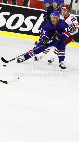 : Greg Chambers (no.24) of Great Britain during ice hockey match of IIHF Ice hockey World championships Division I, group B between Great Britain and Poland. Match between Great Britain and Poland of IIHF Ice hockey World championships Division I, group B was held on Friday, 23rd of April 2010 in Ljubljana, Slovenia.