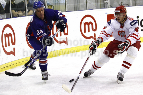 Ljubljana ,Slovenia - 23.04.2010 : Greg Chambers (no.24) of Great Britain (L) and Grzegorz Pasiut (no.18) of Poland (R) during ice hockey match of IIHF Ice hockey World championships Division I, group B between Great Britain and Poland. Match between Great Britain and Poland of IIHF Ice hockey World championships Division I, group B was held on Friday, 23rd of April 2010 in Ljubljana, Slovenia. Photo by: Primoz Jeroncic