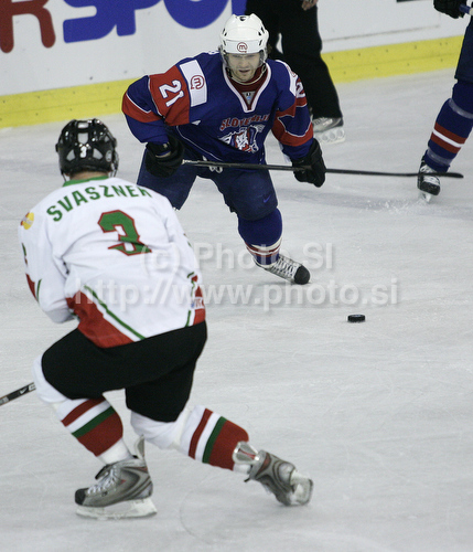 : Andrej Hebar (no.21) of Slovenia (R) shooting next to Bence Svasznek (no.3) of Hungary (L) during ice hockey match of IIHF Ice hockey World championships Division I, group B between Slovenia and Hungary. Match between Slovenia and Hungary of IIHF Ice hockey World championships Division I, group B was held on Friday, 23rd of April 2010 in Ljubljana, Slovenia.