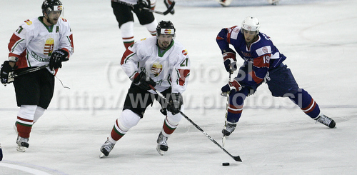 : Janos Vas (no.21) of Hungary (L) and Ziga Pance (no.19) of Slovenia (R) during ice hockey match of IIHF Ice hockey World championships Division I, group B between Slovenia and Hungary. Match between Slovenia and Hungary of IIHF Ice hockey World championships Division I, group B was held on Friday, 23rd of April 2010 in Ljubljana, Slovenia.